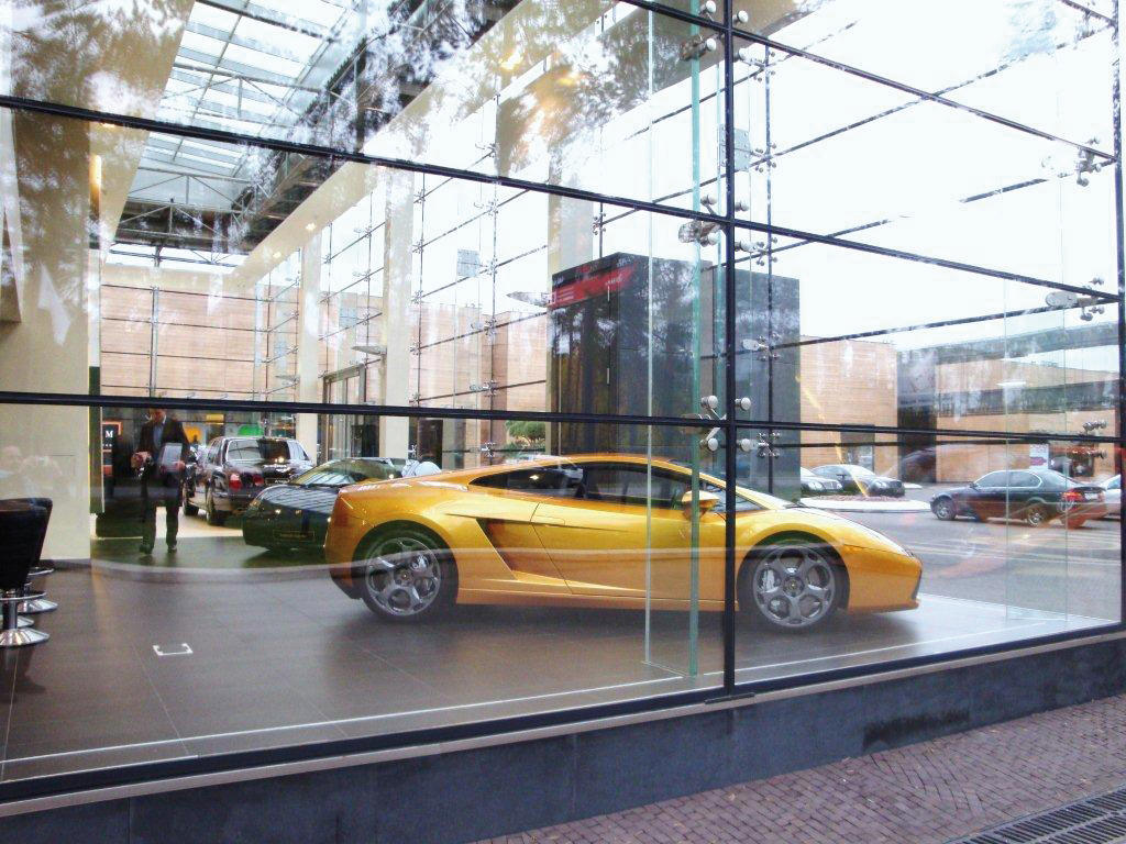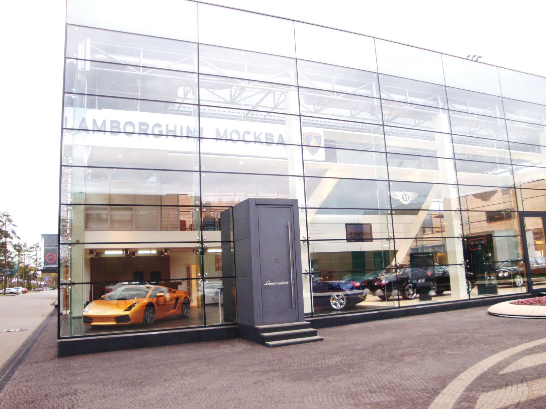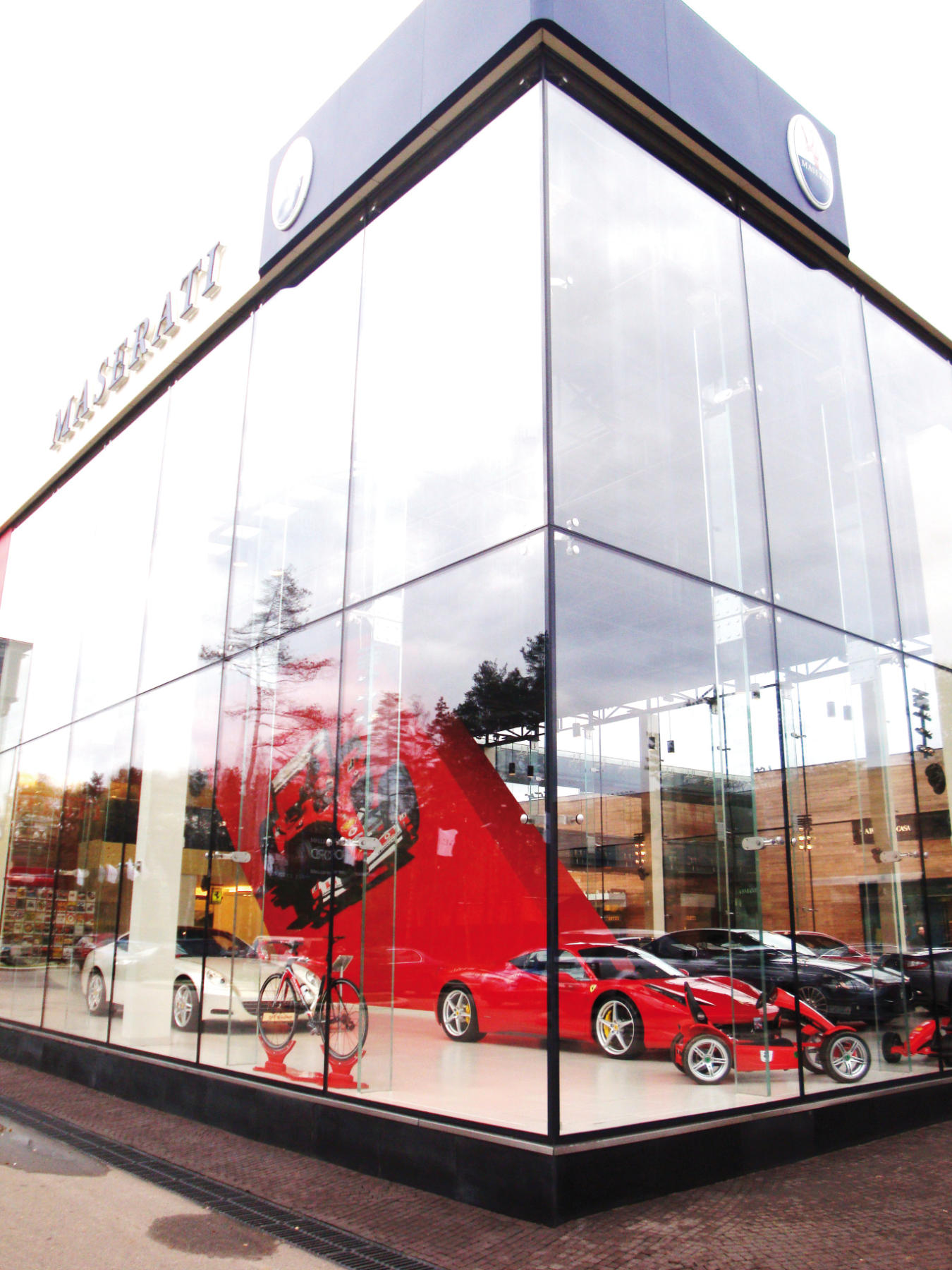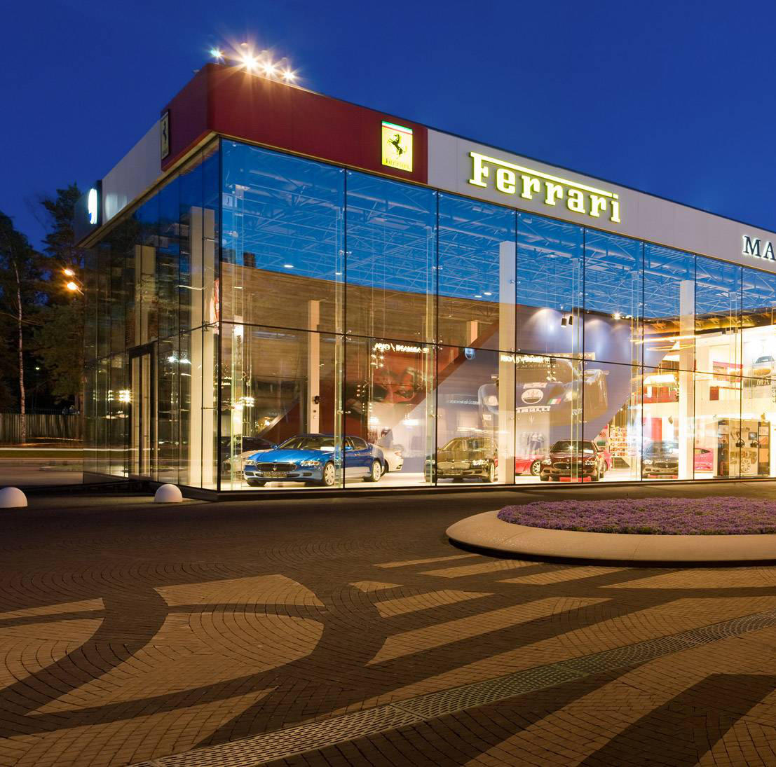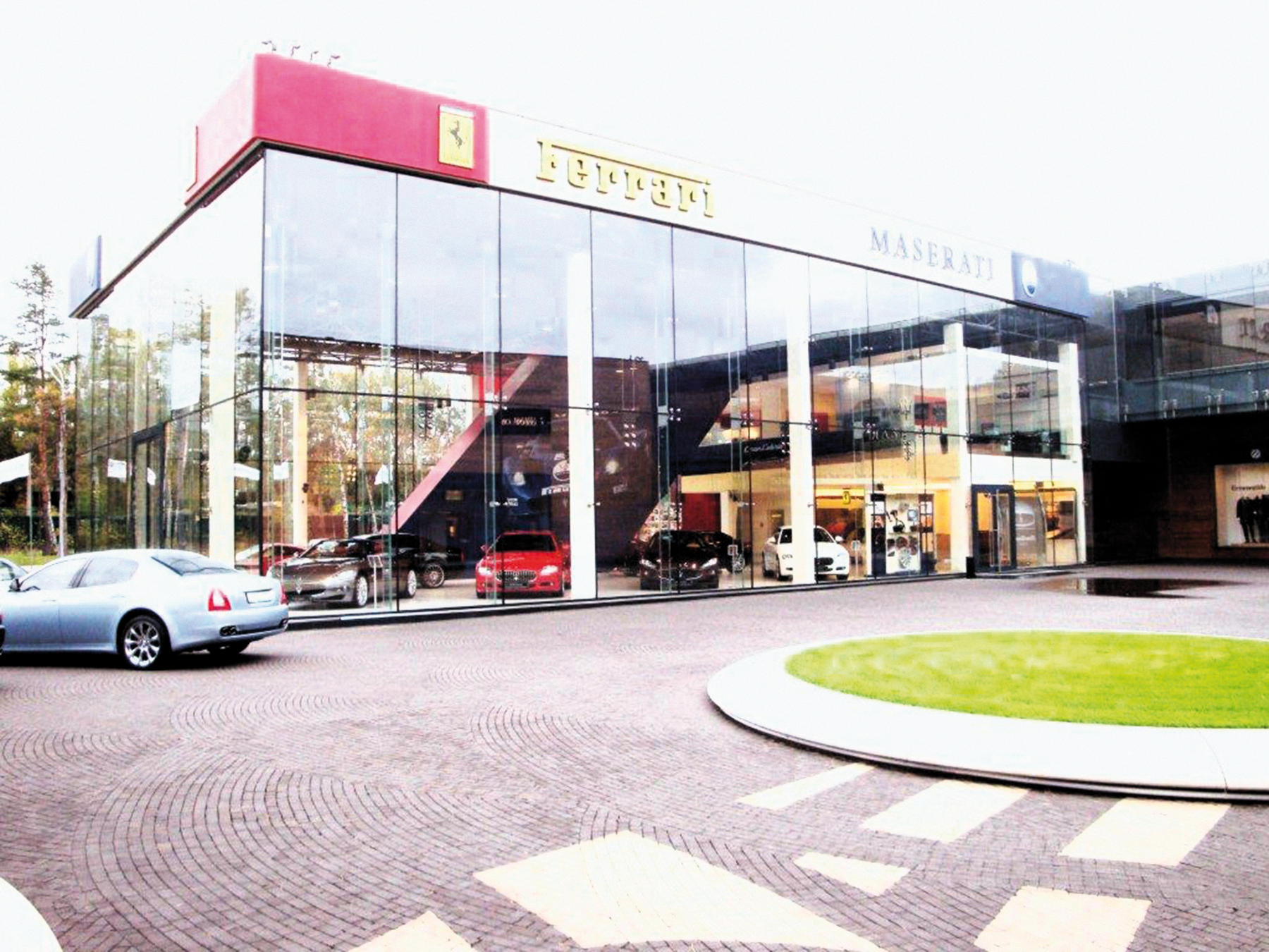 Description: Dealership facades Ferrari- Maserati and Bentley-Lamborghini.