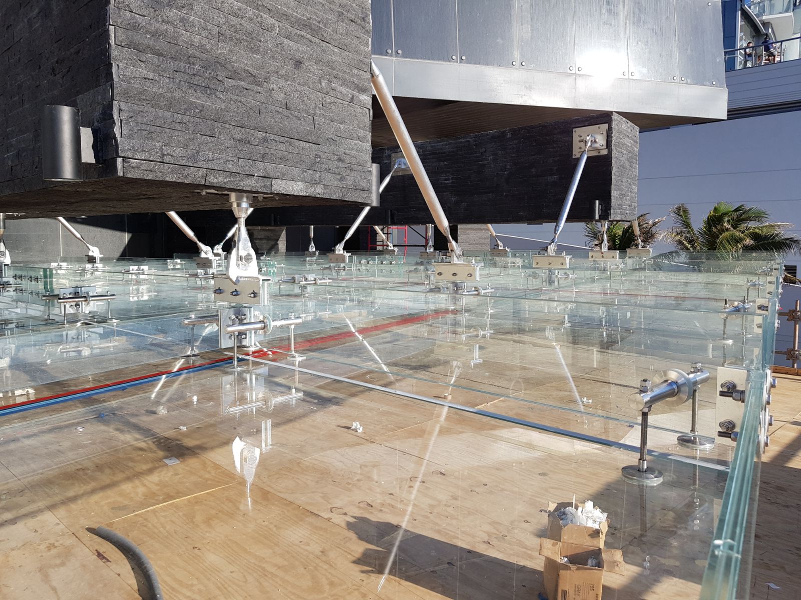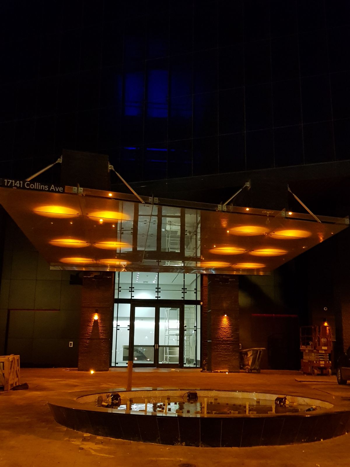 Large entrance canopy to the prestigious Muse residence at 17141 Collins Avenue Sunny Isles Beach. The structure was designed and built with the aim of giving maximum transparency and minimum impact of carpentry elements. The beams are made of glass, articulated with stainless steel elements. The canopy glass is silk-screened for shading. Hurricane tested.