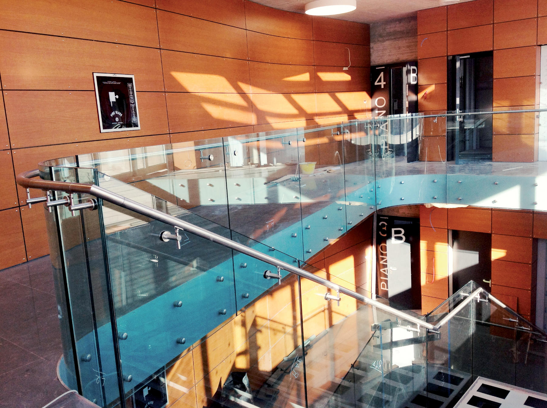 Realizzazione di parapetti in vetro piano e curvo con fissaggio puntuale.