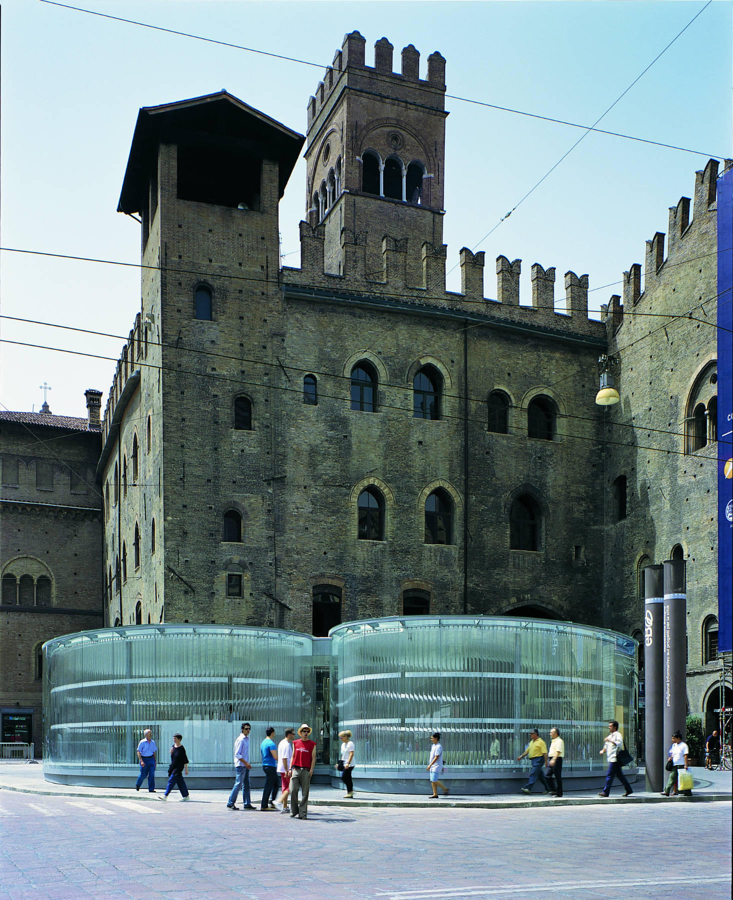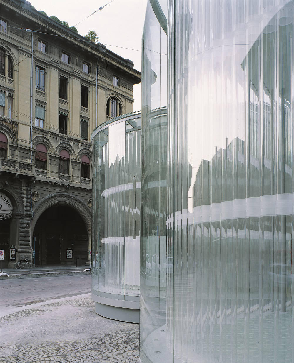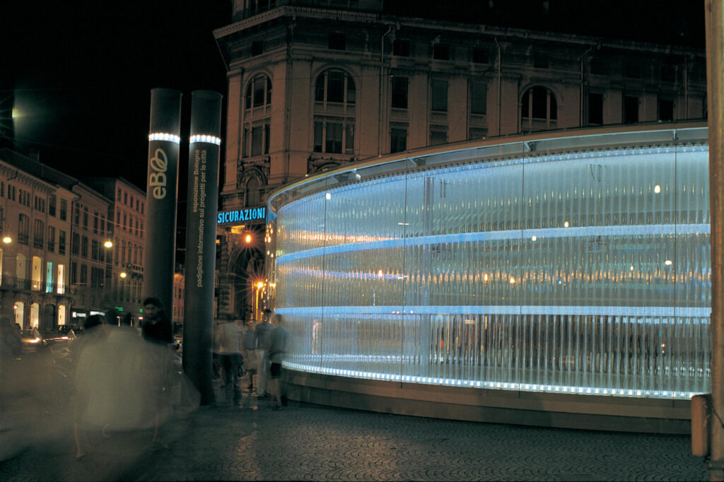 “Le gocce” dell’urban center realizzato a Bologna sono rivestite da una doppia ‘pelle’. La ‘pelle’ esterna di vetro laminato curvo ; la seconda, interna, è invece costituita da una serie di tubi verticali di plexiglas trasparenti.