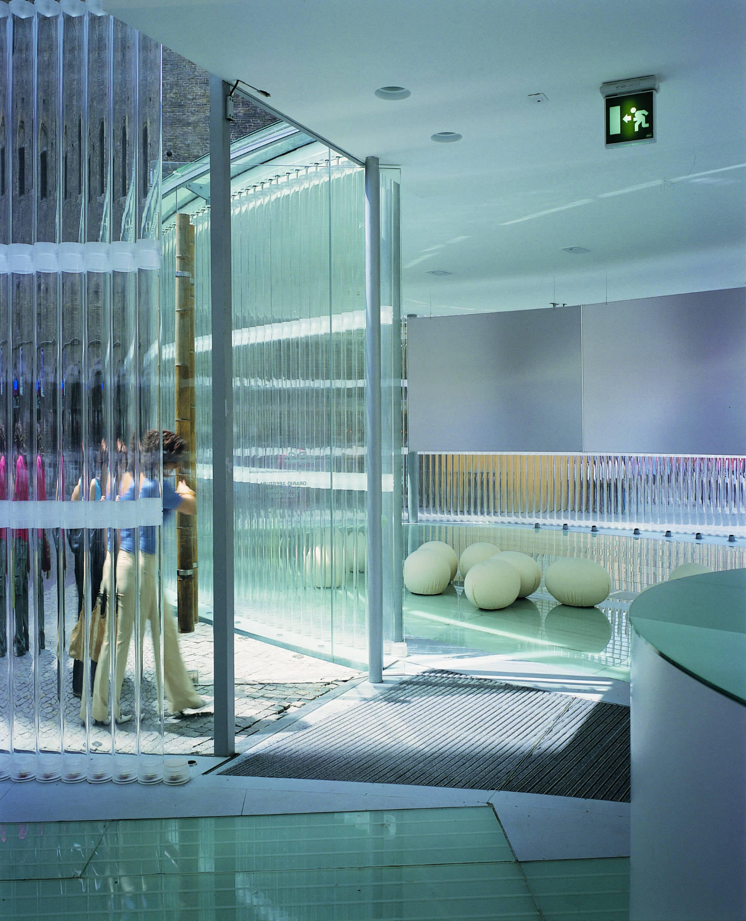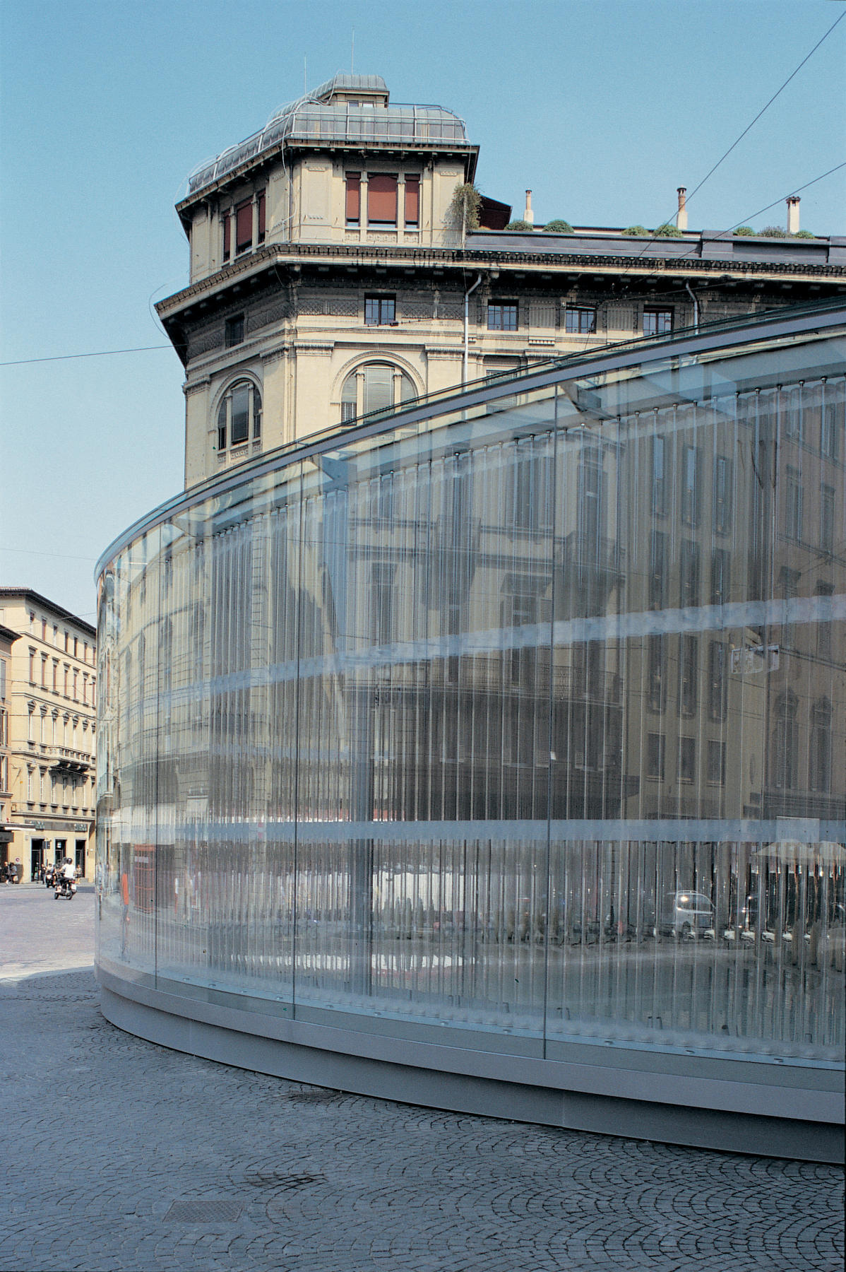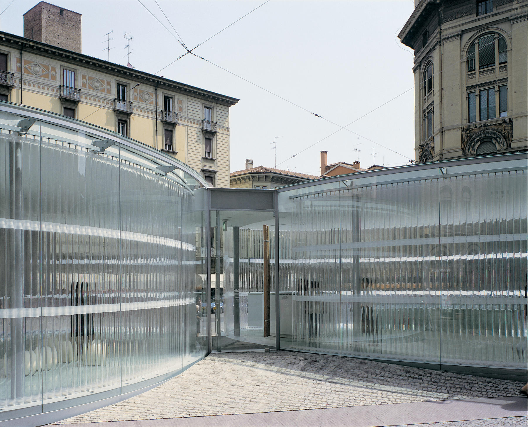 “Le gocce” dell’urban center realizzato a Bologna sono rivestite da una doppia ‘pelle’. La ‘pelle’ esterna di vetro laminato curvo ; la seconda, interna, è invece costituita da una serie di tubi verticali di plexiglas trasparenti.